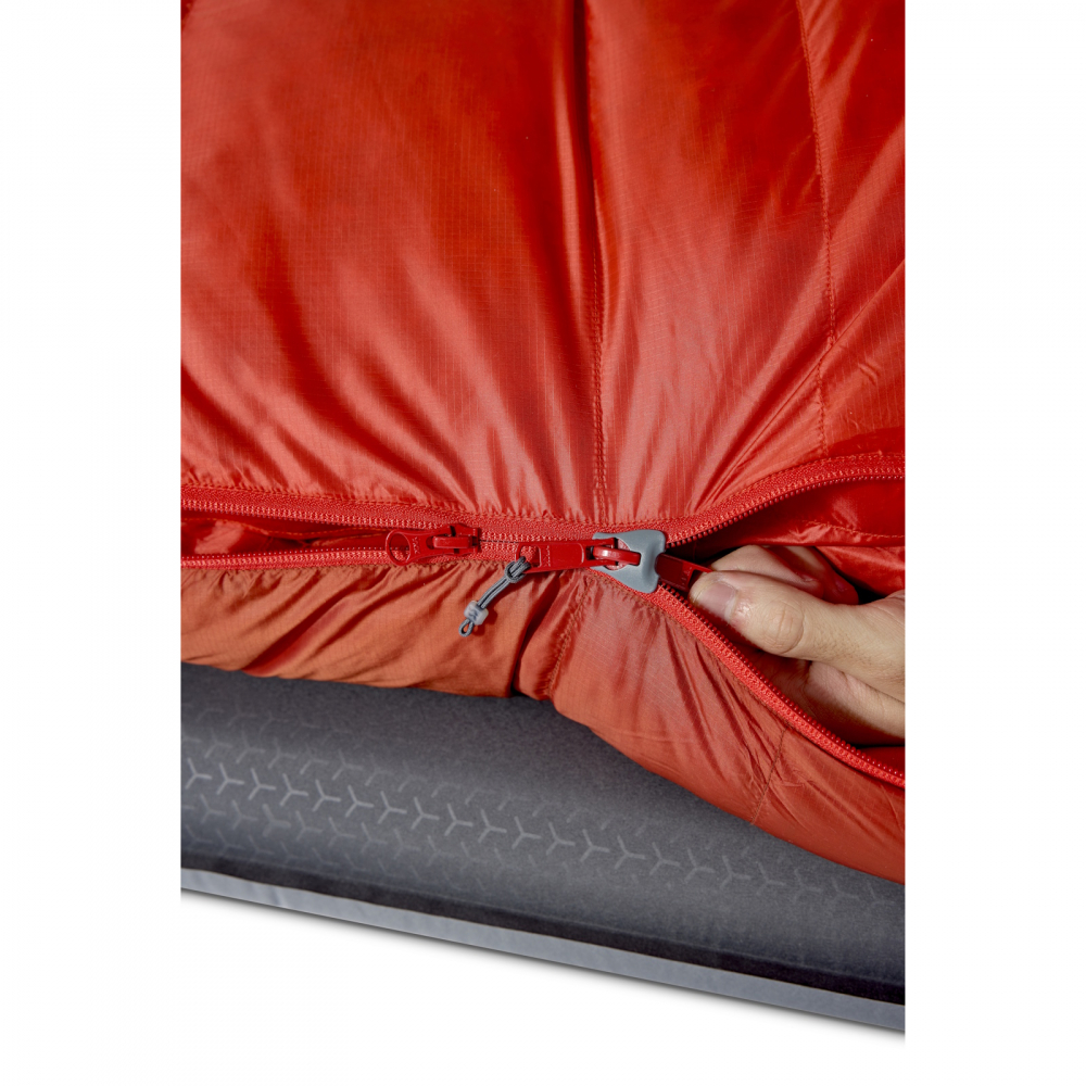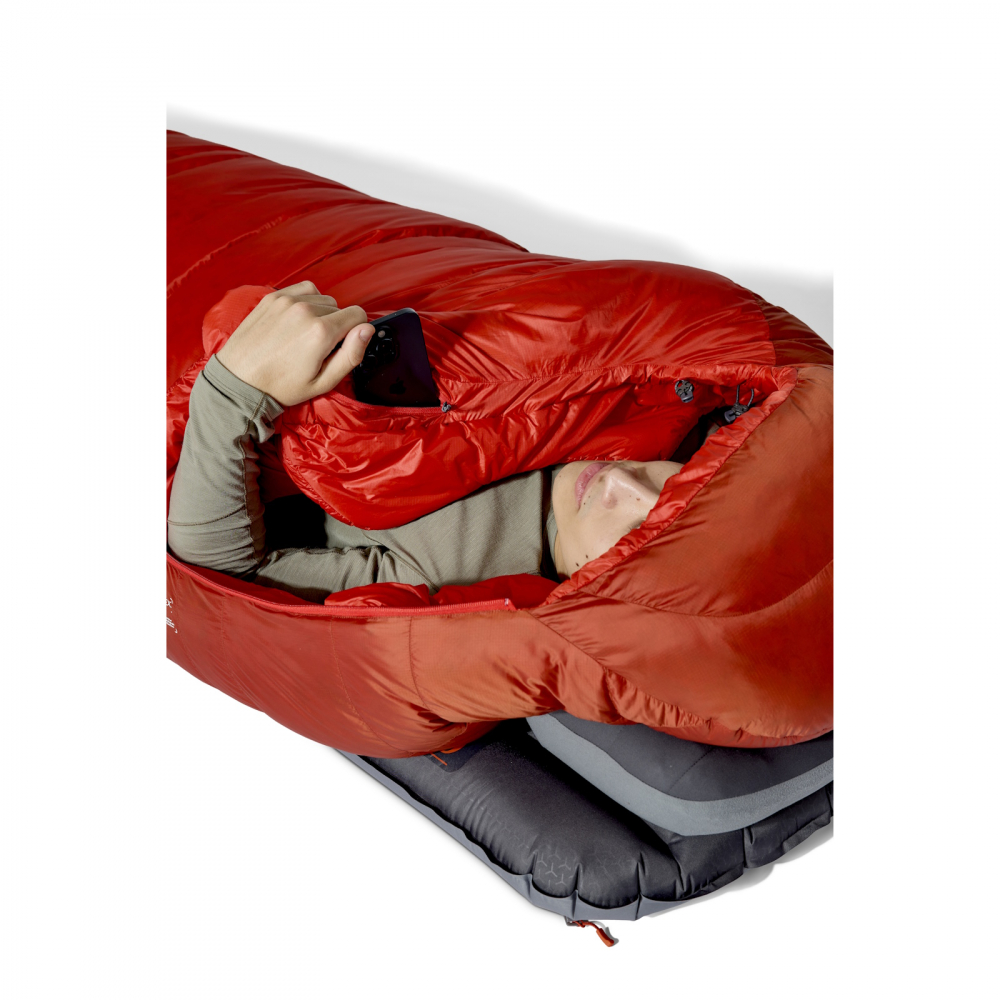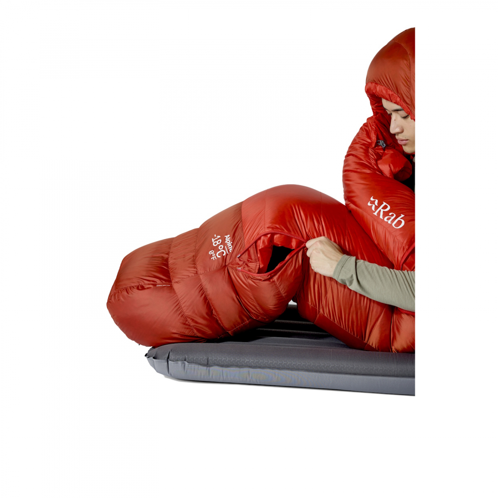 Rab Alpine -6 är mumieformad och rätt normal i sina mått. Absolut inte überrymlig men ej heller supertrång. Huvan sluter om gott och värmekragen förhindrar att värmen sipprar ut kring halsen. Dragkedjan är ¾-lång och har dubbla löpare så du även kan öppna upp nedtill för att ventilera ut överskottsvärme. Innerficka finnes för dig som vill hålla mobilen/pannlampan varm under natten. Eller kanske bara önskar ha lite nattasnacks nära till hands.